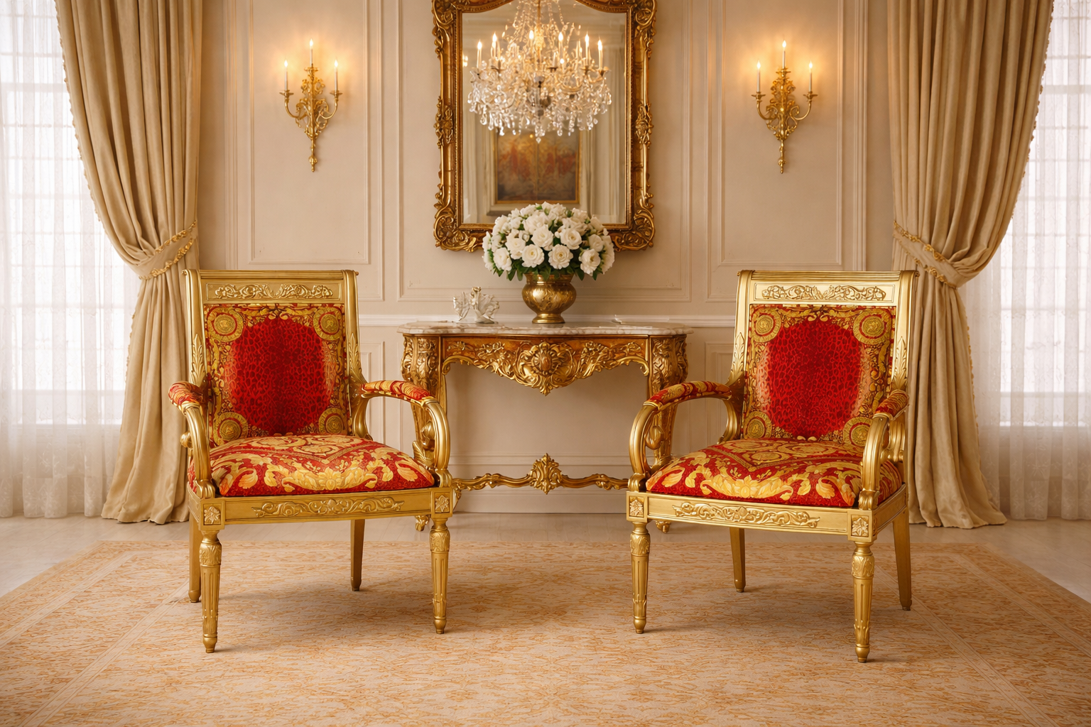 Luxury Custom Vanitas Armchair in Versace Barocco Leopard Red Heavy Upholstery Fabric - Pair or Two Pieces