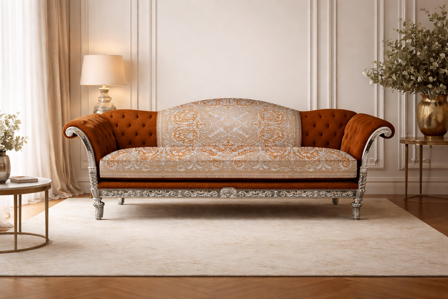 Luxury 3-Seater Custom Tzar Sofa Covered In Versace Baroque Orange Silk Fabric Diamond Button Back-Seat and Arm